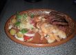 Hierfür haben wir ein Hühnchen langsam in Wurzelgemüse geschmort. In der Zwischenzeit haben wir einen Tomatenrisotto aus Zwiebel, Knoblauch, frische Tomaten, entkernter Chili und Tomatensauce zubereitet. Als das Hähnchen nach ca. 1,5 Stunden fertig war haben wir den Sud ohne Gemüse mit ungesüßter Schokolade zum Kochen gebracht und mit Salz und Pfeffer und Thajun Gewürzmischung abgeschmeckt. Abgebunden haben wir das mit Maismehlwasser. Einkochen lassen bis die Sauce schön sämig war. Dazu gab es ein grünen Salat.